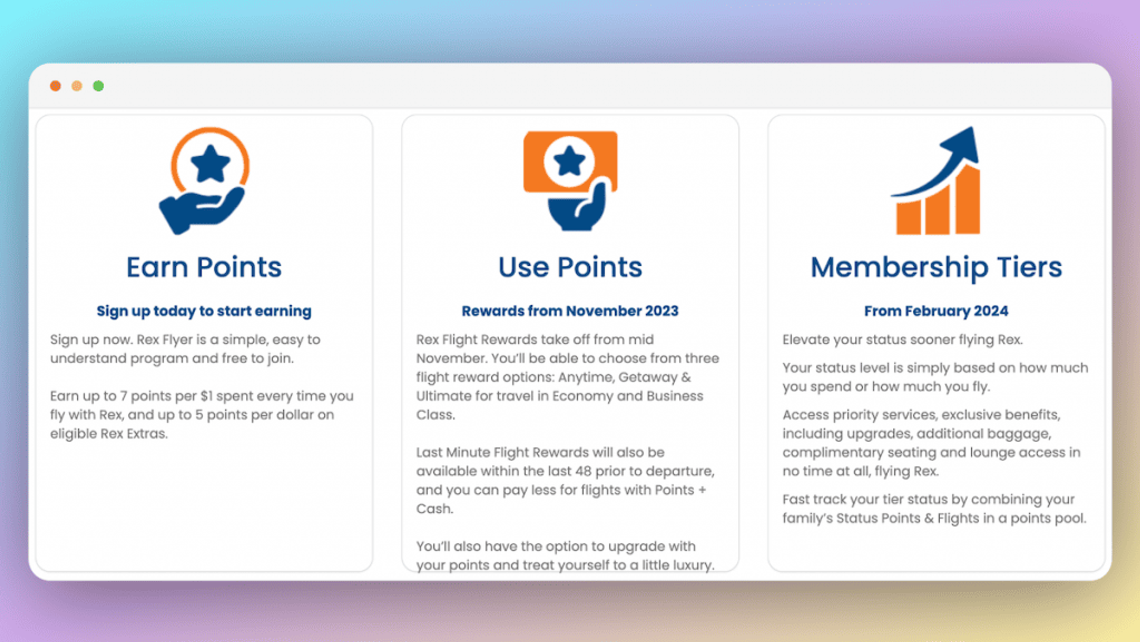 From mid-November Rex Flyer members will be able to use their points to redeem flights. The cost of a redemption is set per route and tied to the cash value of each fare. Members have three types of rewards to choose from;