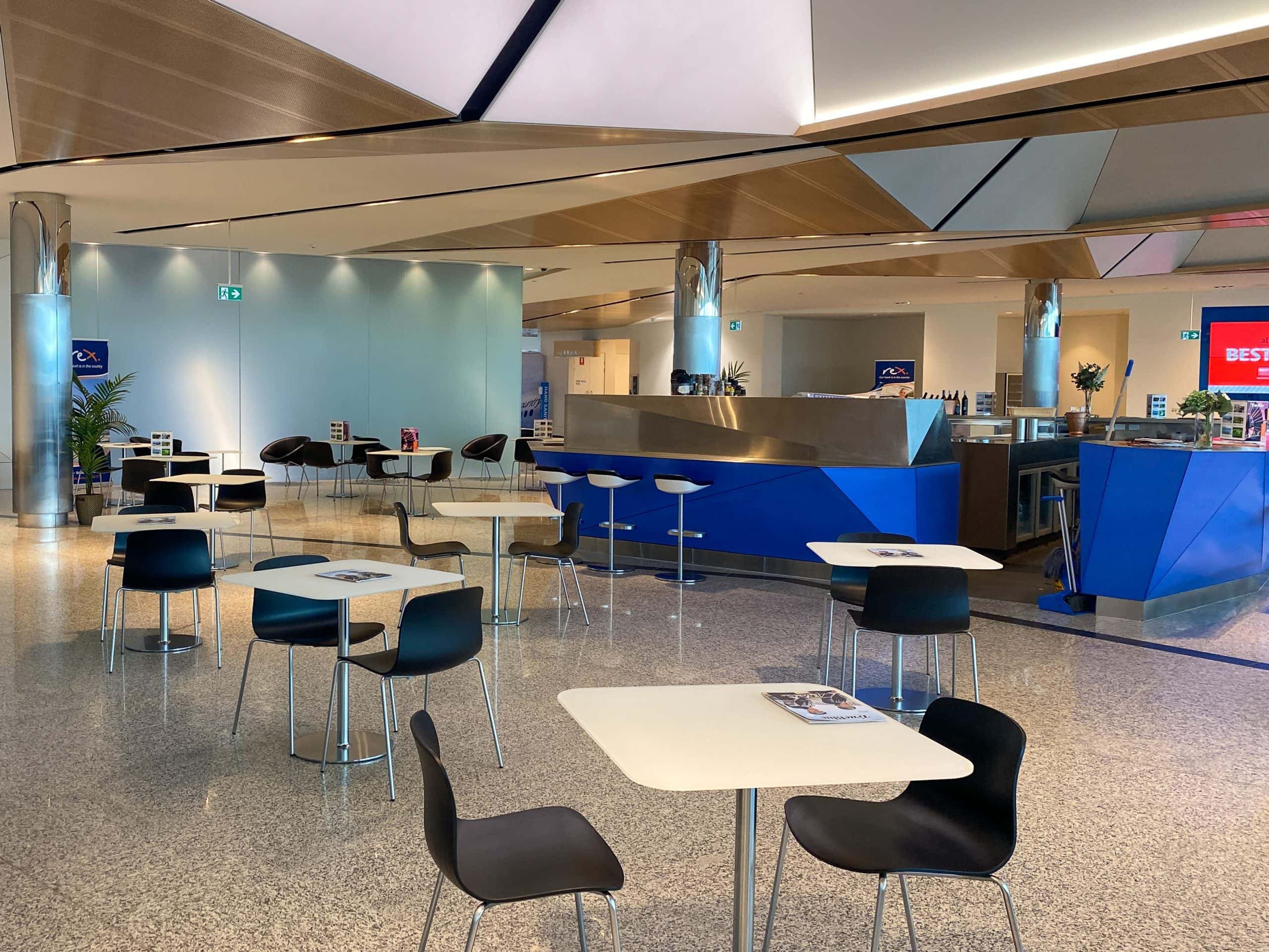 A bar acts as the main food and drinks area in the centre of the lounge. Tables and chairs surround the bar, with several barstools also offered.