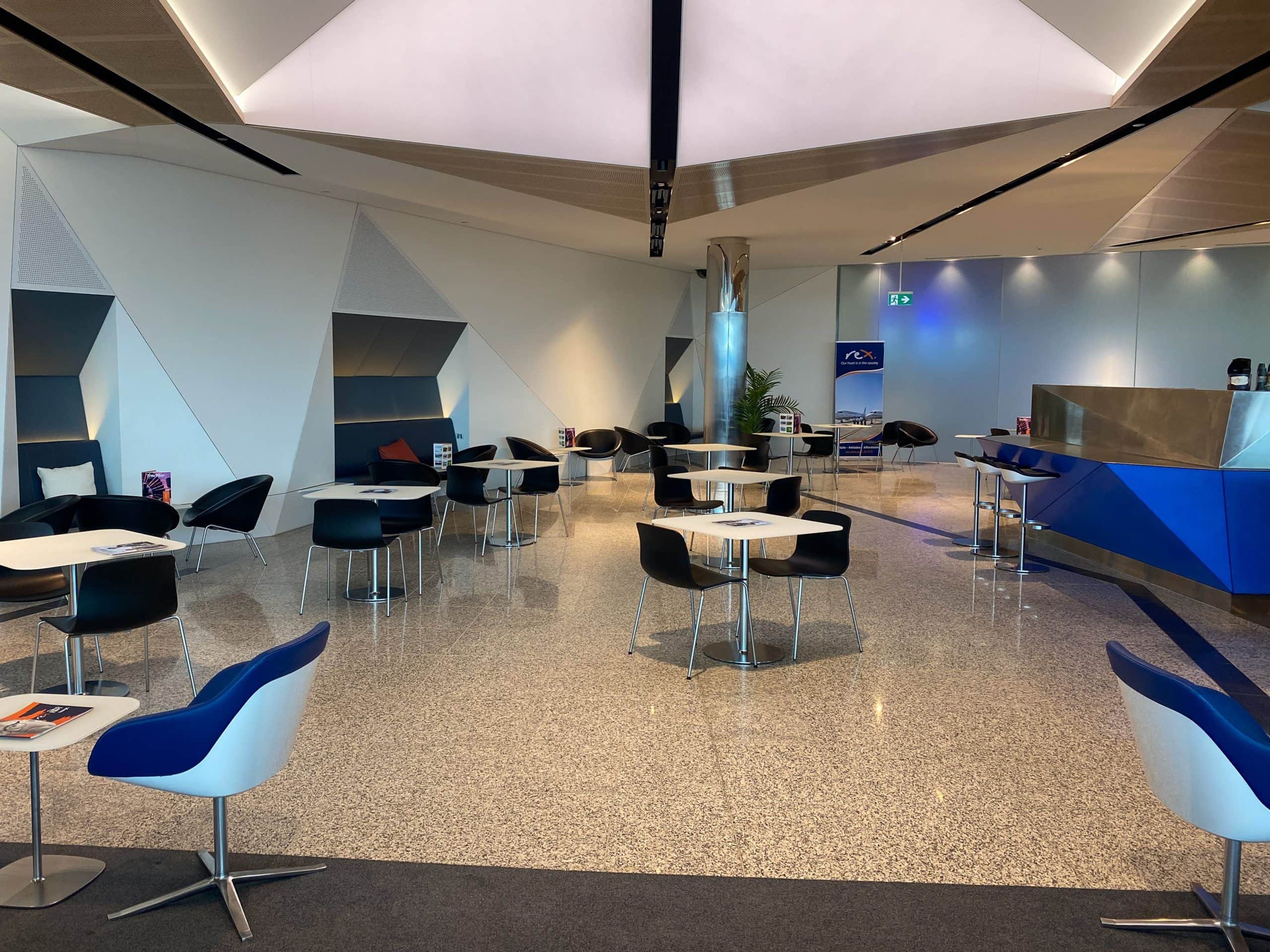 Rex’s Canberra lounge is miles apart from the rest of the Rex lounge network. Through the glass doors you’ll find a large open space, fitted out with Rex branding and striking geometric patterns throughout.