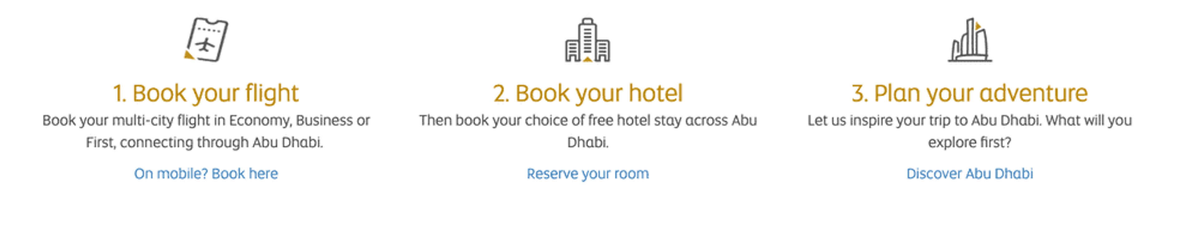 - Valid for adults travelling on one-way or return tickets, transiting through Abu Dhabi for more than 24 hours. The “Free Stopover” can only be used on one leg of the journey, via Abu Dhabi.