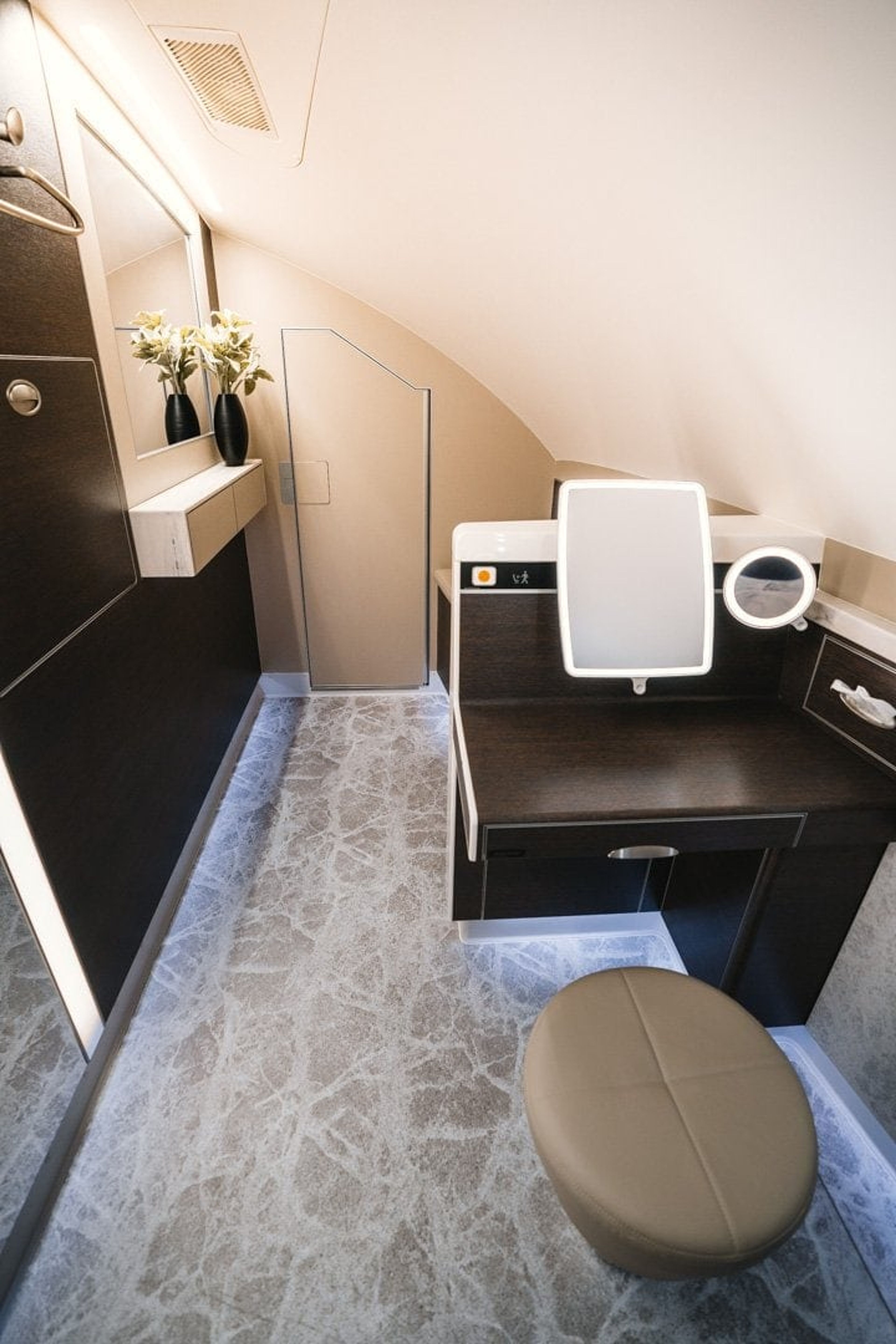 Getting changed isn’t a matter of a matter of squeezing yourself into a tiny aircraft toilet on the Singapore Airlines A380; both bathrooms are very spacious (they really should have included a shower) and rather beautiful. I’m not a fan of taking bathroom photos usually but I make an exception for Singapore Airlines.