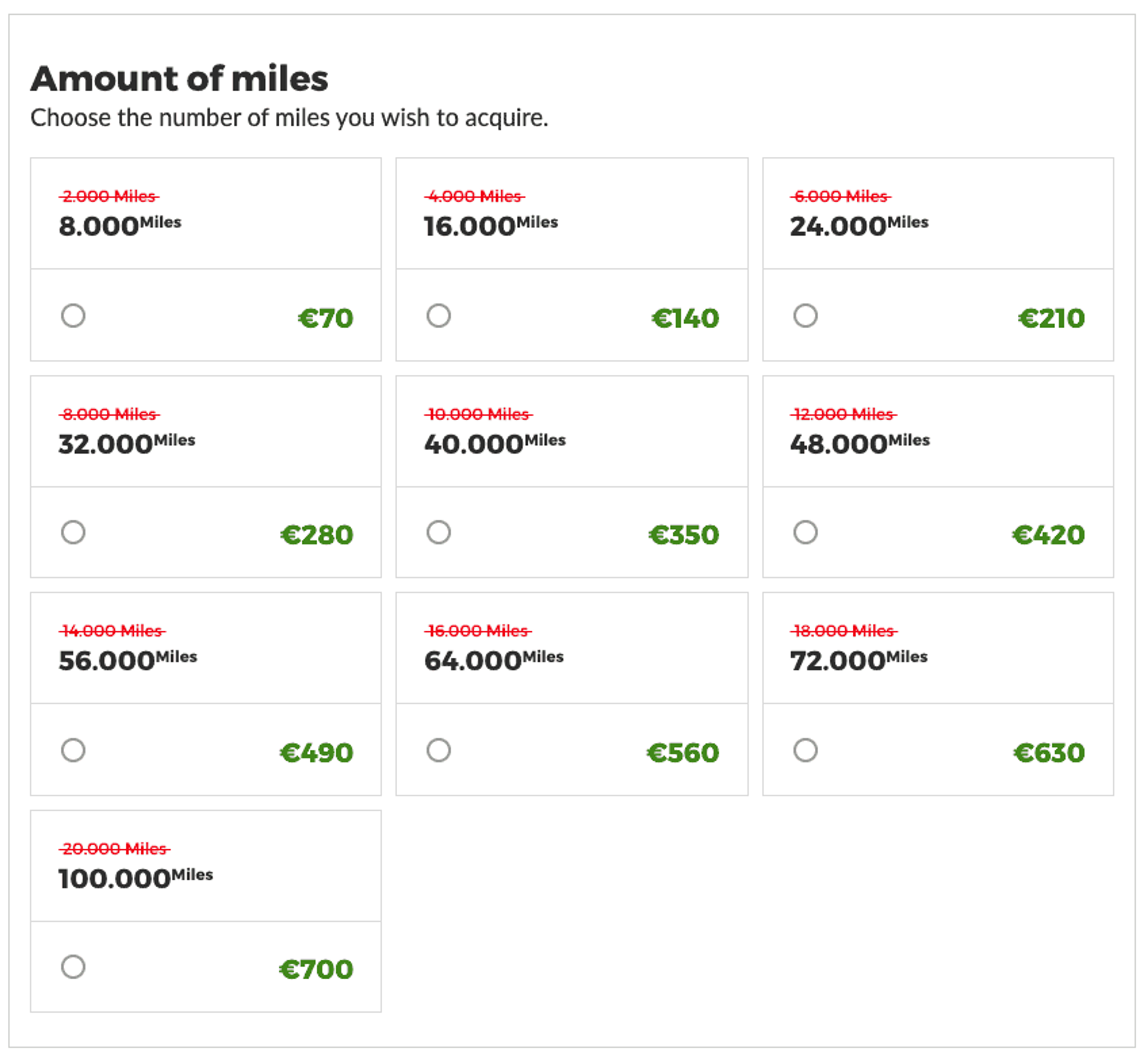 The next step is to either buy miles for the Miles&Go program or joint Club Tap Miles&Go. The cheapest miles option is 70 Euro or around AU$120 for 8,000 miles.