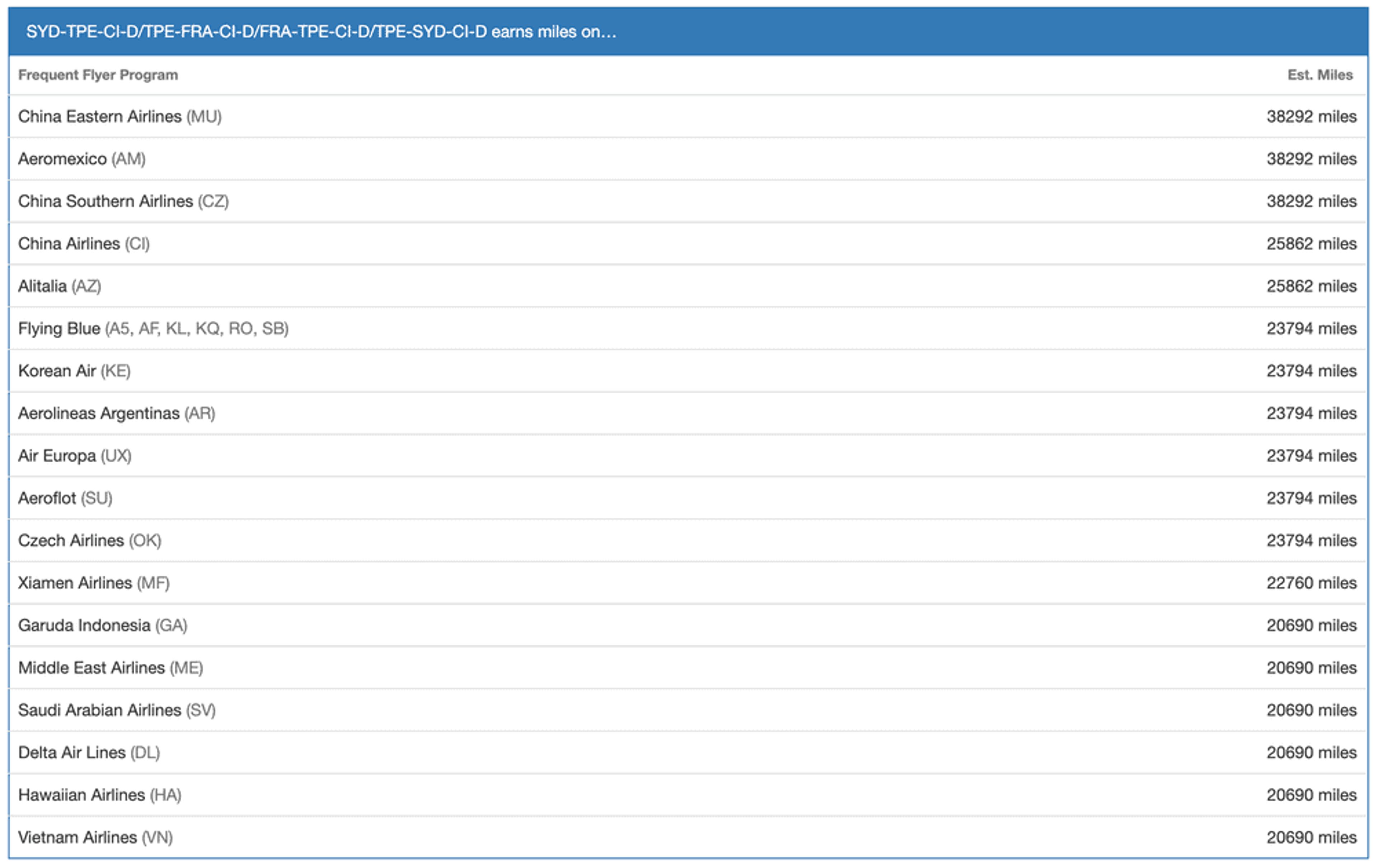 - Miles Earned: Since China Airlines are part of Skyteam, the options are a bit limited for Australian based travellers, but here’s how much you can earn: