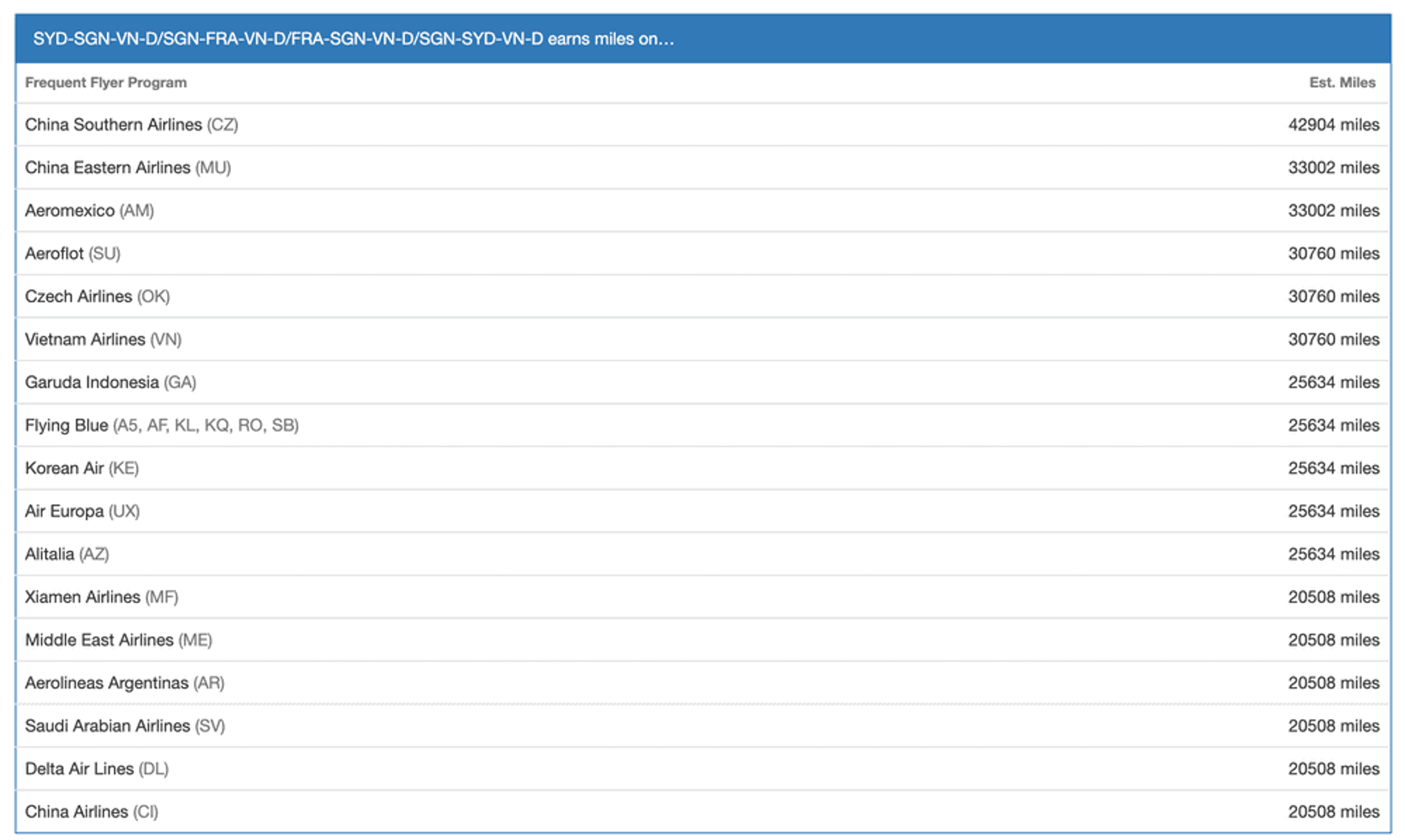 Miles Earned: Since Vietnam Airlines are part of Skyteam, the options are a bit limited for Australian based travellers, but here’s how much you can earn: