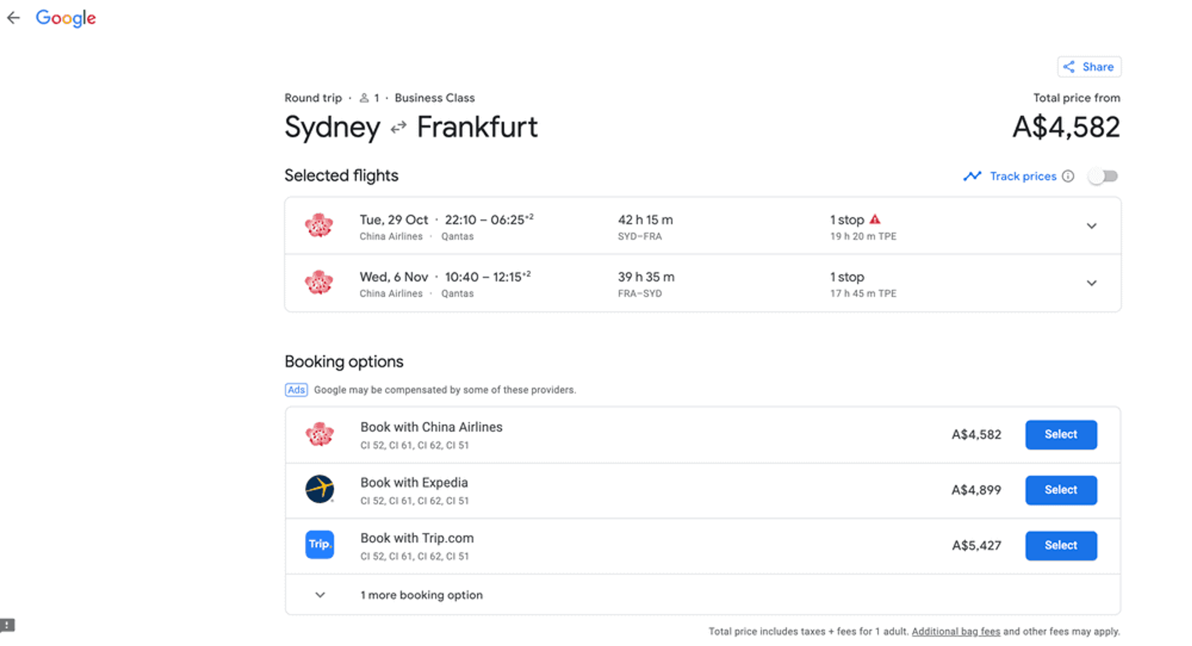 China Airlines is the Taipei based airline, not to be confused with Air China or China Southern (which also offer similar business class pricing but the product doesn’t stack up with Vietnam Air and China Airlines). Prices are slightly higher and start at $4582 when booked direct.