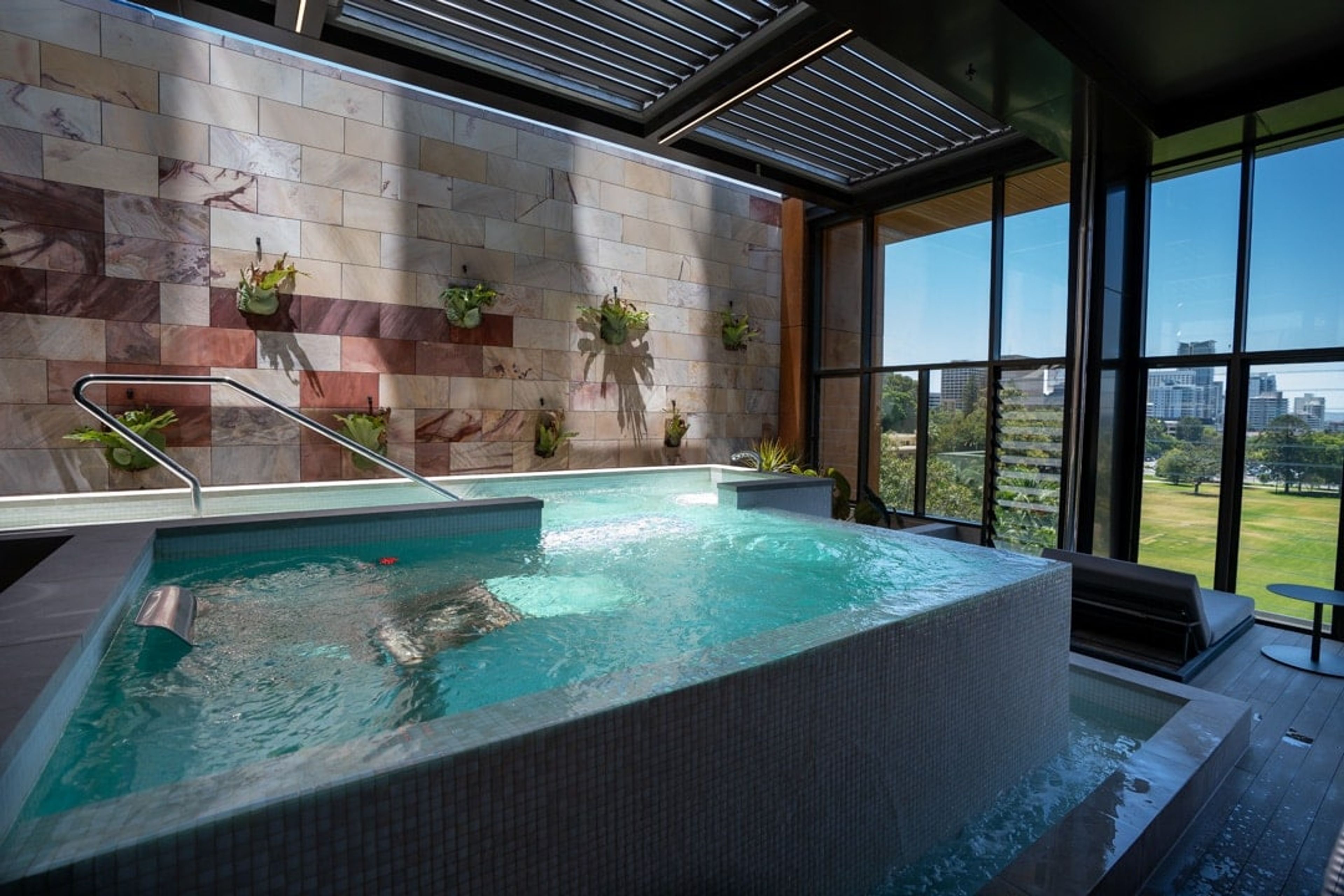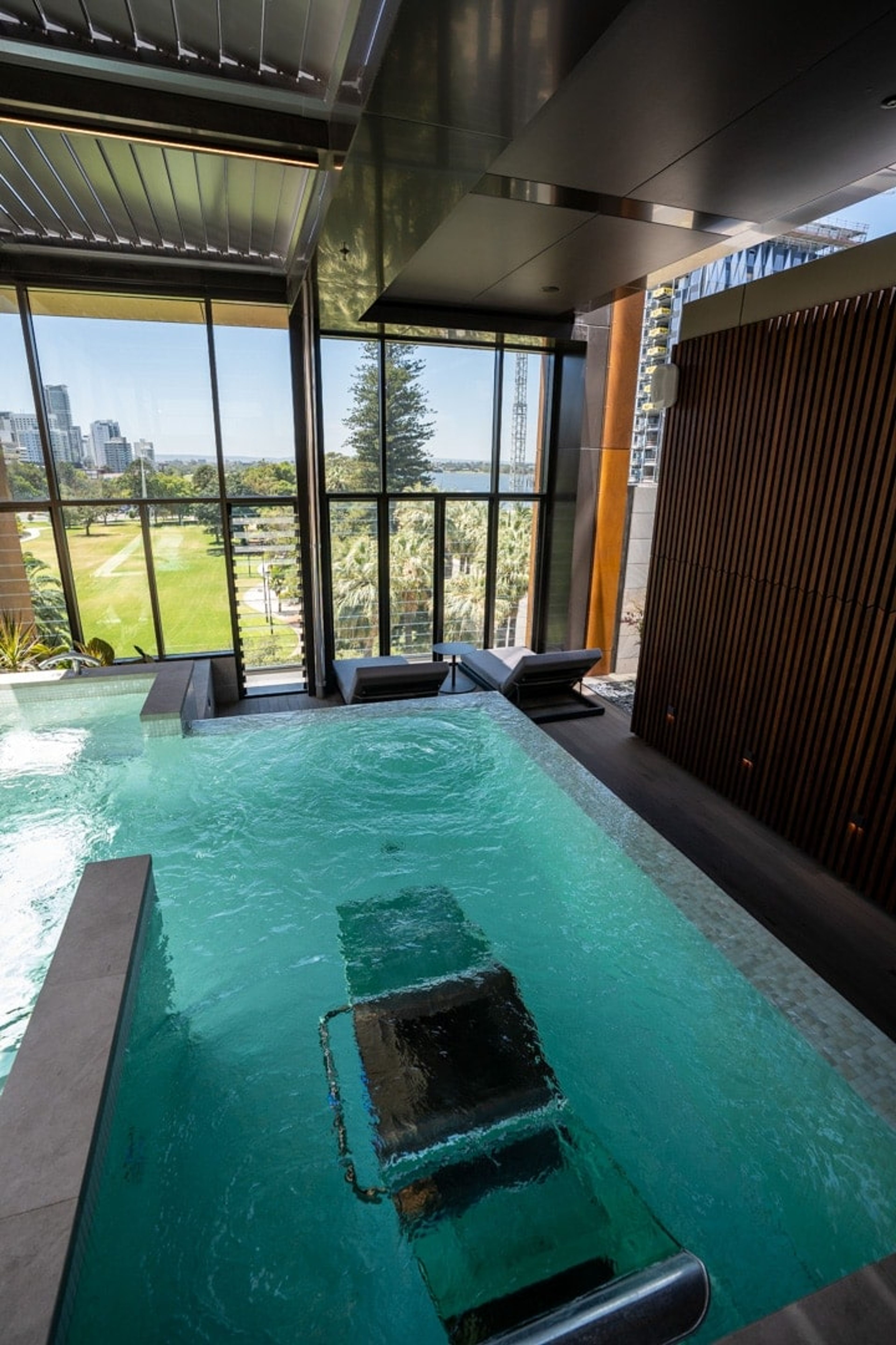 The pool overlooks Elizabeth Quay, and although it’s an infinity pool, Australian nanny laws make sure there’s a rather ugly and dirty glass screen at the edge to prevent any `natural selection’ from occurring.