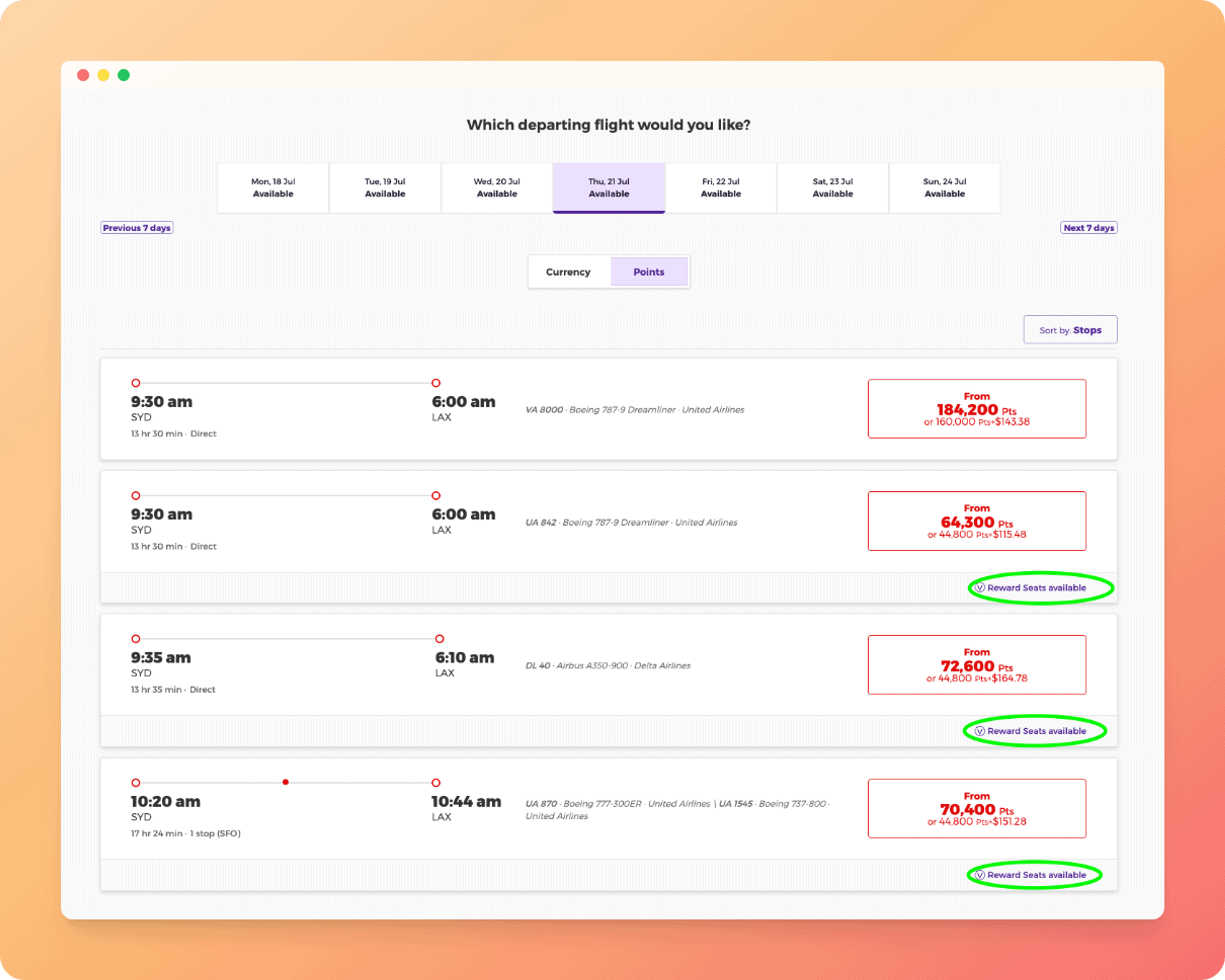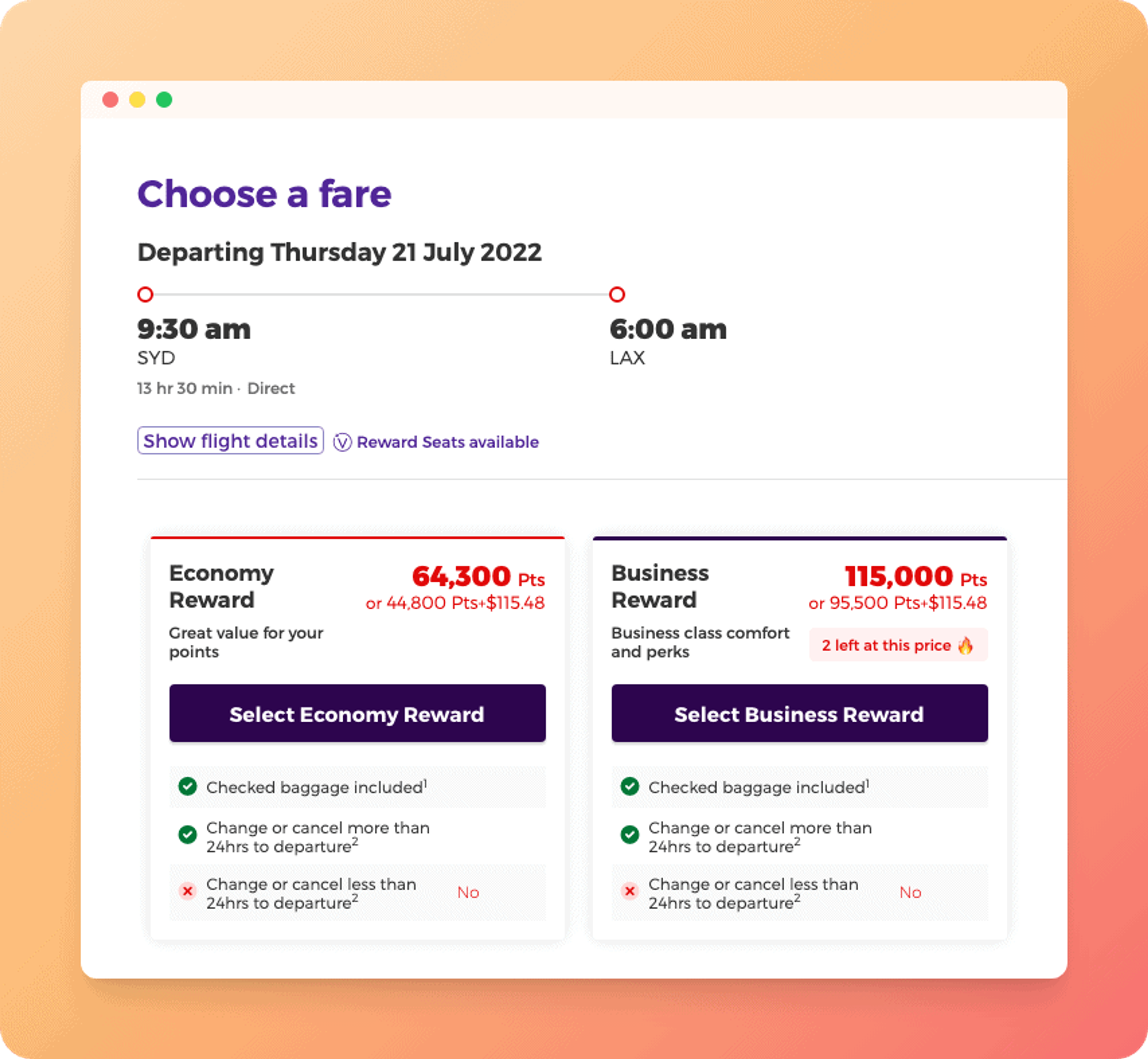 If you needed to catch a specific flight on a specific date and can’t find the Reward Seat you want, you might notice the option for an Any Seat redemption. These fares are calculated based on the current cash price and are much easier to find. On Any Seat bookings, you will earn Velocity Points and Status Credits.