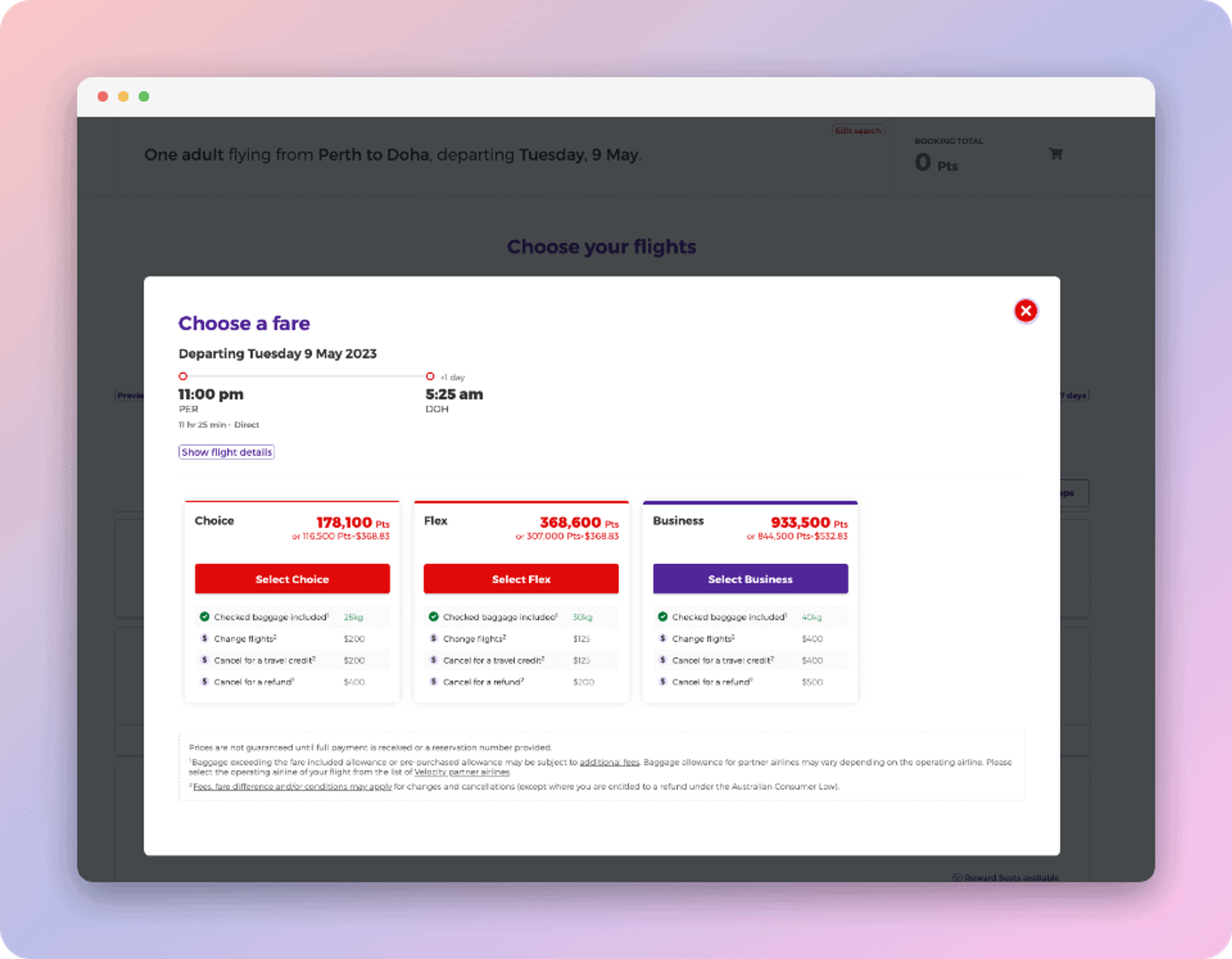 * The quoted redemption fare is correct as at 8 May 2023 and is subject to change. Fares are subject to availability. Points value is based on an international one-way Business Reward Seat fare with Virgin Australia or one of their partner airlines and must be booked through “https://experience.velocityfrequentflyer.com/flying-status/use-points-for-flights” Velocity website. Taxes, fees and carrier charges are payable in addition to Velocity Points redeemed. A Virgin Australia carrier charge is payable per sector, per person. Reward Seats and associated charges are not eligible for Points earn. Seats are limited and may not be available at peak times or on all flights. Price may vary until ticketed. Payment surcharge may apply. You can change or get a refund for your booking by paying a fee and any fare difference, at least 24 hours before scheduled departure. You may also request a refund for other reasons, including under the Australian Consumer Law. View the Velocity Rewards Seat fare rules for more information. Some flights may be operated by a partner airline. Full terms and conditions at velocityfrequentflyer.com