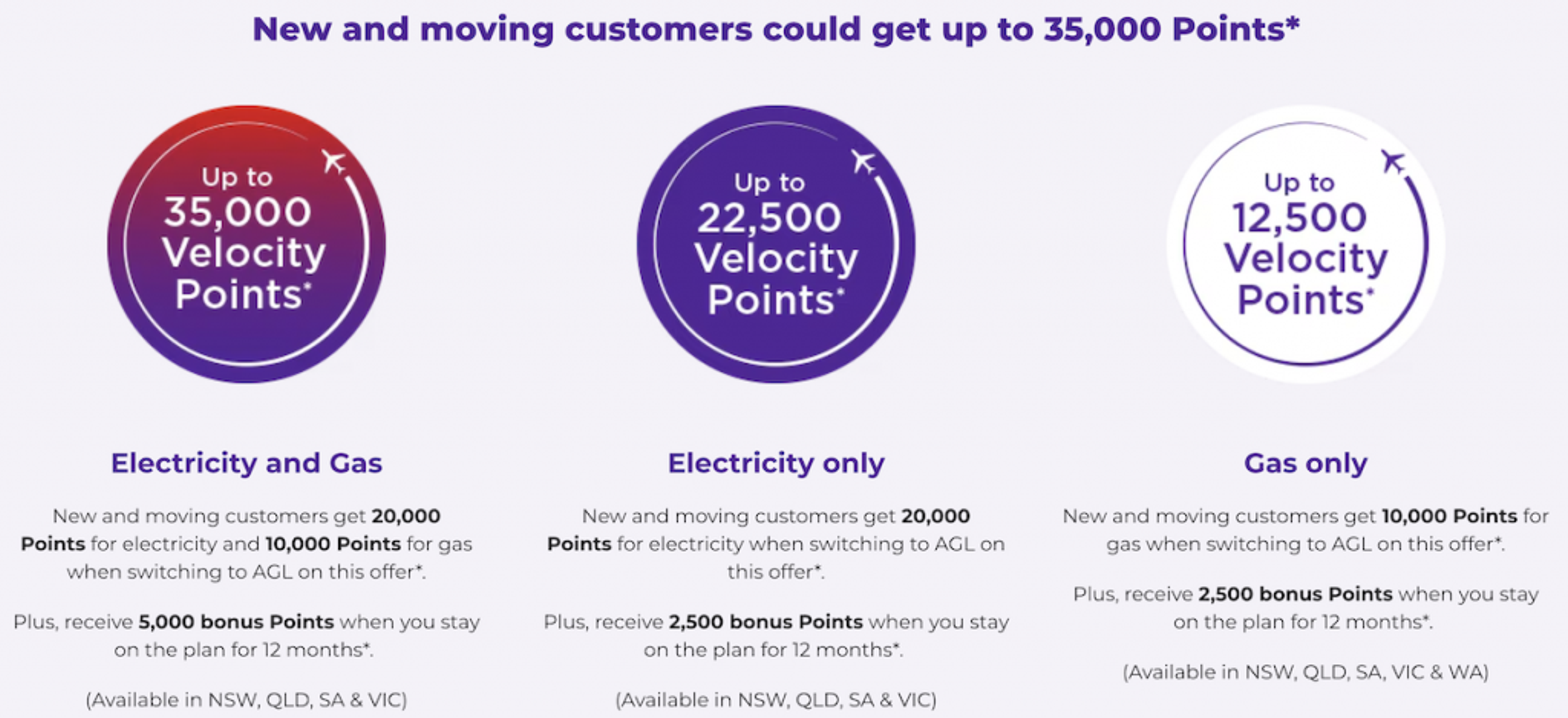 You can now earn Velocity Points on selected AGL gas and electricity plans, in areas that AGL services. The amount of bonus Velocity Points you earn depends on the plan you sign up for;