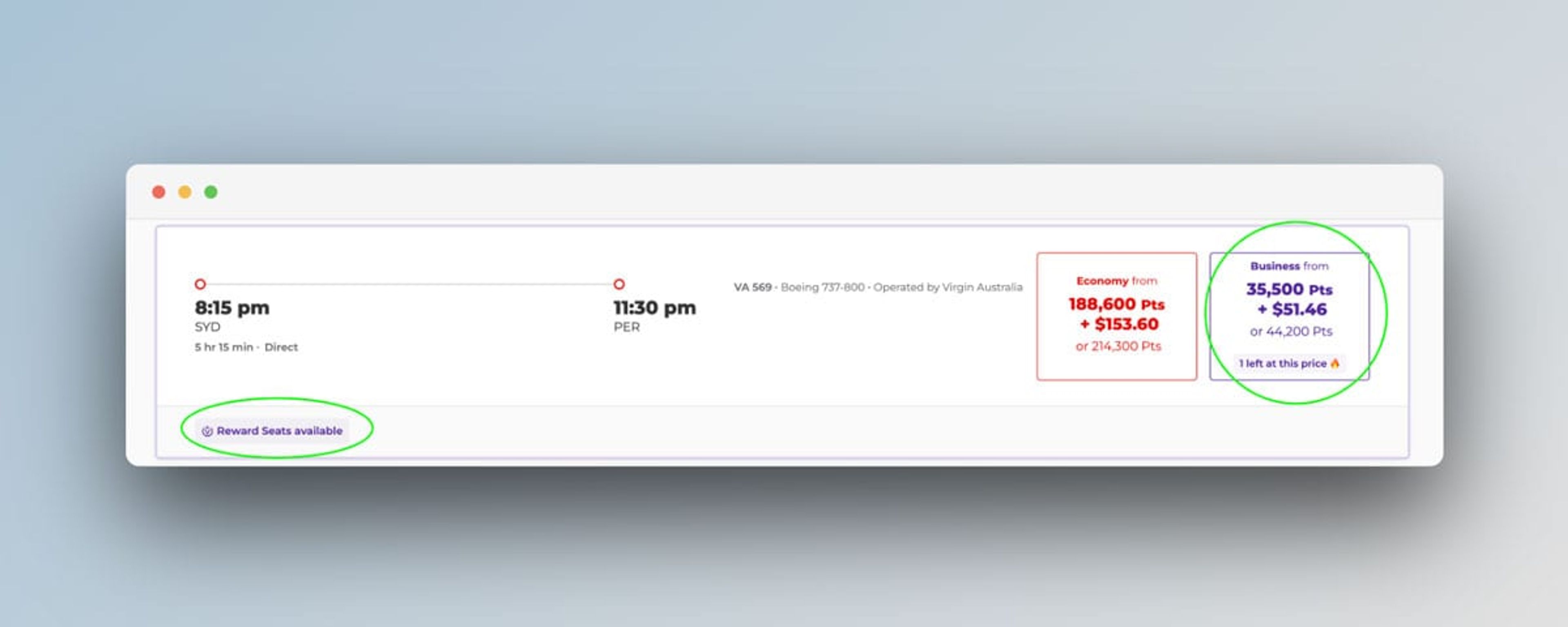 A handy tip to see if you can redeem your UpgradeMe voucher is to first check if an award seat is available. You can do this by logging into the Virgin Australia website, clicking “book with points”, and looking out for the small logo on the search results page that reads “award seat available”.