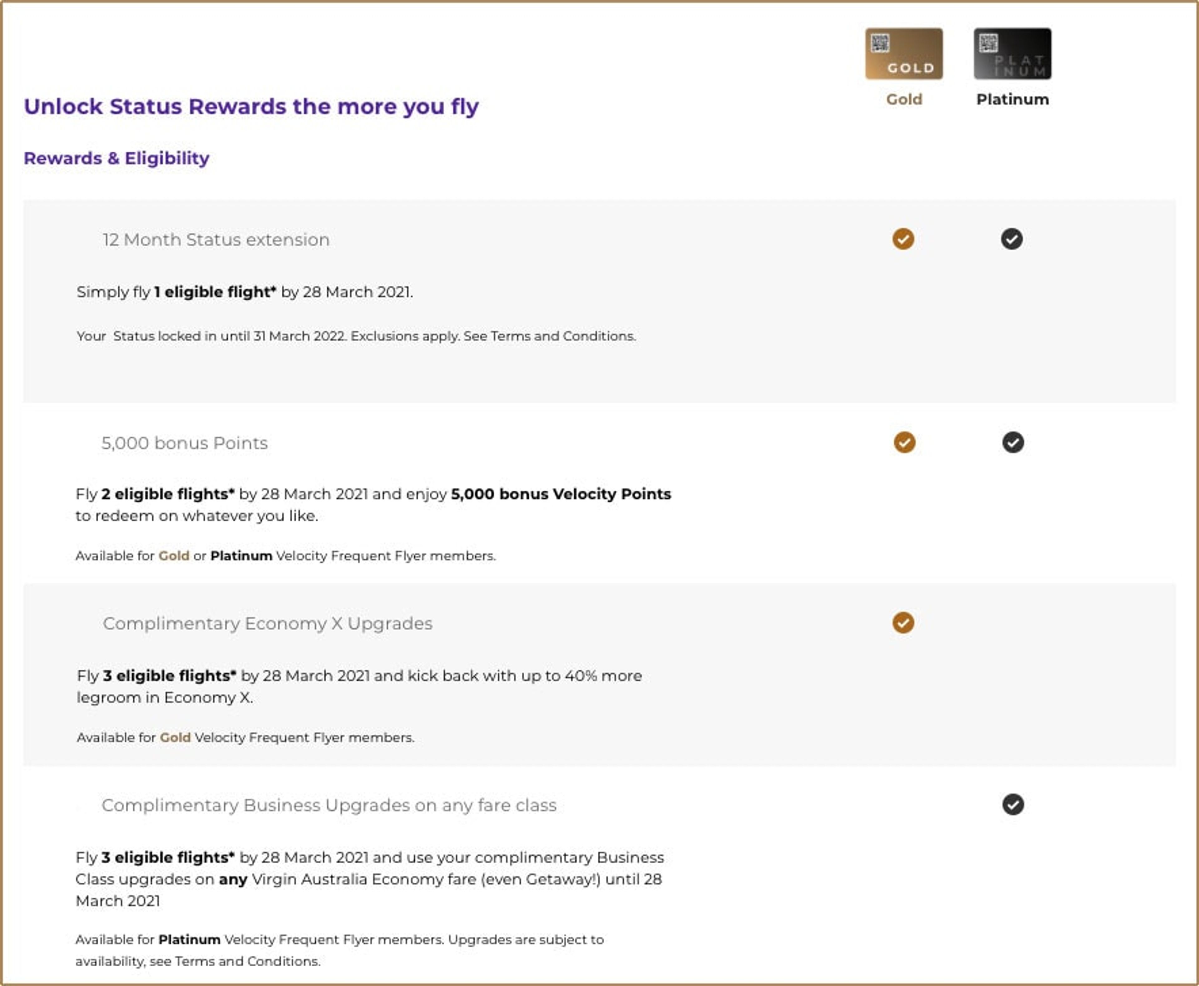 As a one-up over the Qantas offer, Velocity is offering its Gold and Platinum frequent flyers some extra perks on the second and the third flight they take before March 28, 2021.