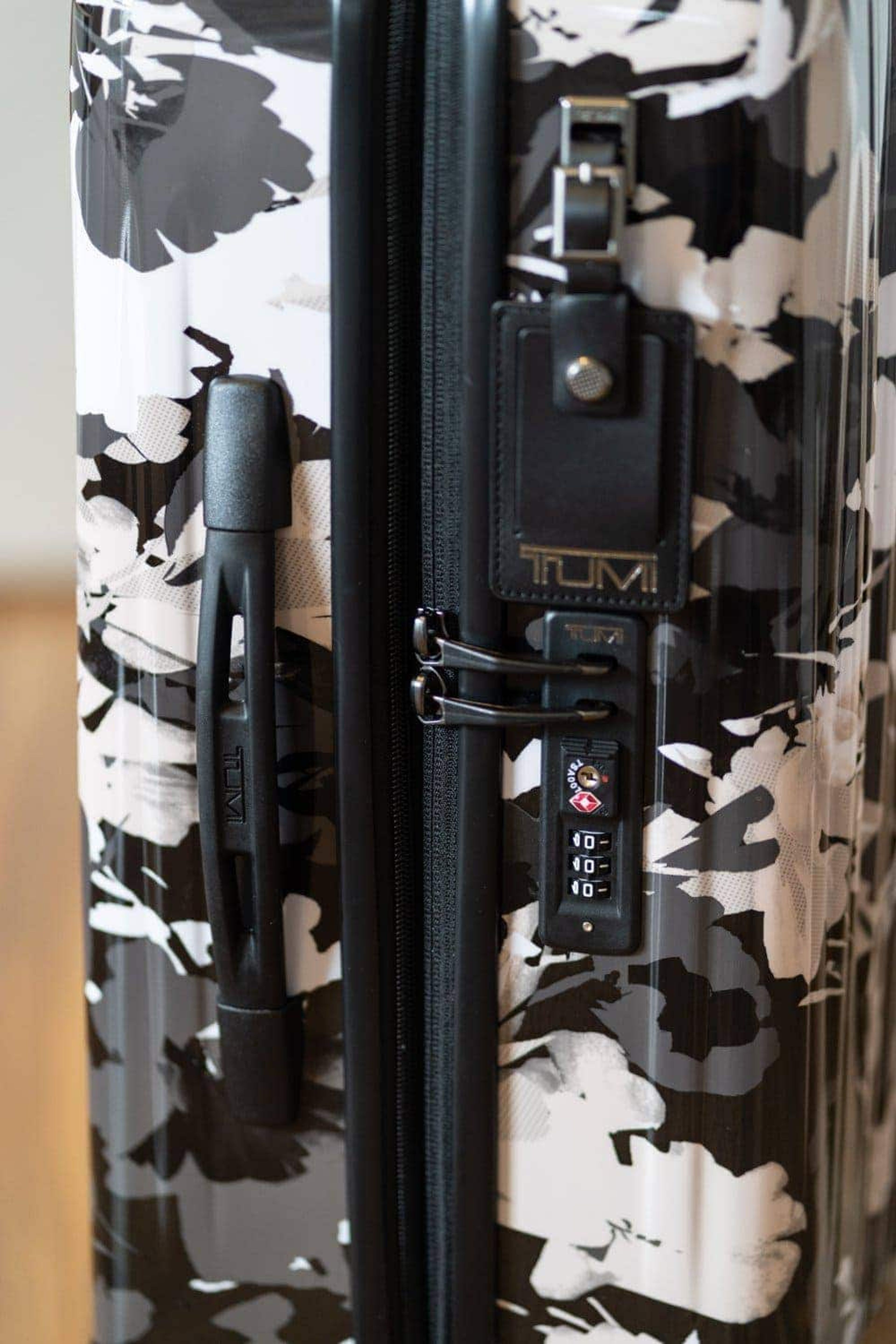 The V3 is a 4 wheeled roller with a customisable leather initials tag (you can take it into any Tumi store to get your initials hot stamped on it), detachable luggage tag and very sturdy TSA approved combination lock.